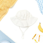 To keep the wide brim baby sun hat in soft sand looking its best, hand wash in cold water with mild detergent. Lay flat to dry and avoid bleach or ironing to preserve fabric integrity and colour. Keep your baby cool and protected with this stylish sun hat.